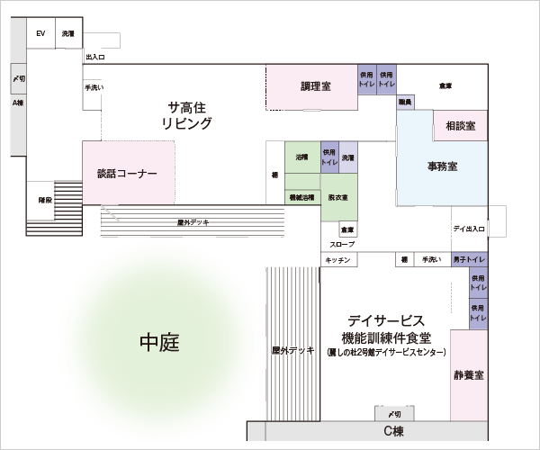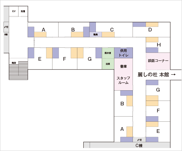 | Iタイプ | 132,000円 | 合計額には、家賃・共益費・サービス費が含まれています。 食事代、水光熱費は実費のため含まれていません。 (サービス費、週4日利用の場合) |
